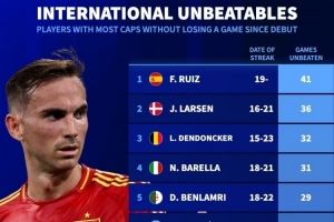 体育资讯11月20日讯 德国转会市场统计了本世纪球员国家队首秀之后的连续不败场次数据,并列出榜单,法比安·鲁伊斯连续41场不败居首。